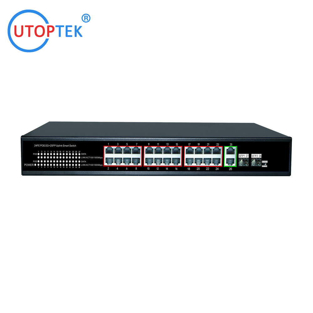 1) Puerto POE de 24*10/100Mbps, puerto UP-Link de 2*10/100/1000Mbps, 2x1000M SFP conectado