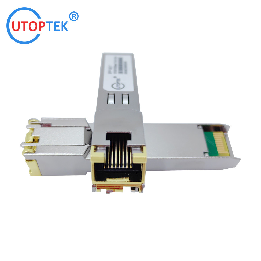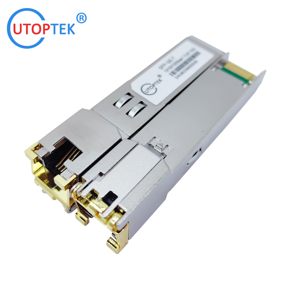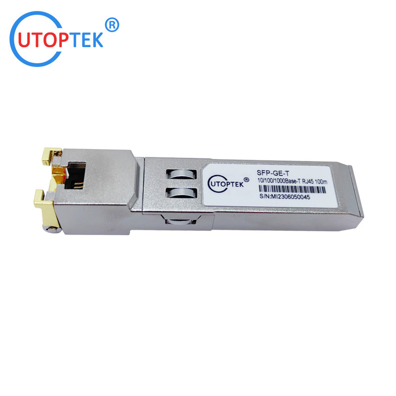UTOPTEK’s 100 Mbps El transceptor SFP de cobre 10/100BASE-T es un módulo de alto rendimiento y rentable que cumple con los estándares Gigabit Ethernet y 10/100BASE-T especificados en IEEE 802. 3-2002 e IEEE 802.3ab, que admite una velocidad de datos de 10/100 Mbps con un alcance de hasta 100 metros a través de un cable de par trenzado sin blindaje de categoría 5. El UT-GLC-T admite enlaces de datos dúplex completo de 10/100 Mbps con señales de modulación de amplitud de pulso (PAM) de 5 niveles. Los cuatro pares del cable se utilizan con una velocidad de símbolo de 250 Mbps en cada par. El SFP-FE-T proporciona información de ID serie estándar compatible con SFP MSA, a la que se puede acceder con la dirección A0h a través del protocolo EEPROM CMOS serie de 2 hilos. También se puede acceder al IC físico a través del bus serie de 2 hilos en la dirección ACh.